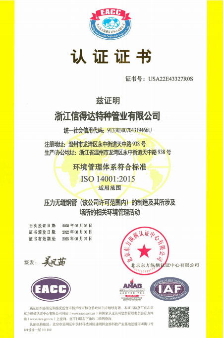 公司已全面通過了ISO9001:2008質量管理體系認證、14000環境管理體系認證、18000職業健康管理體系認證、國家質量檢驗檢疫總局A2-B類壓力管道元件制造許可、 歐盟PED認證及德國AD-2000產品強制認證、美國ASME材料產品認證、信得達擁有1條穿孔生產線,10條冷拔生產線8條冷軋特種無縫鋼管生產線。